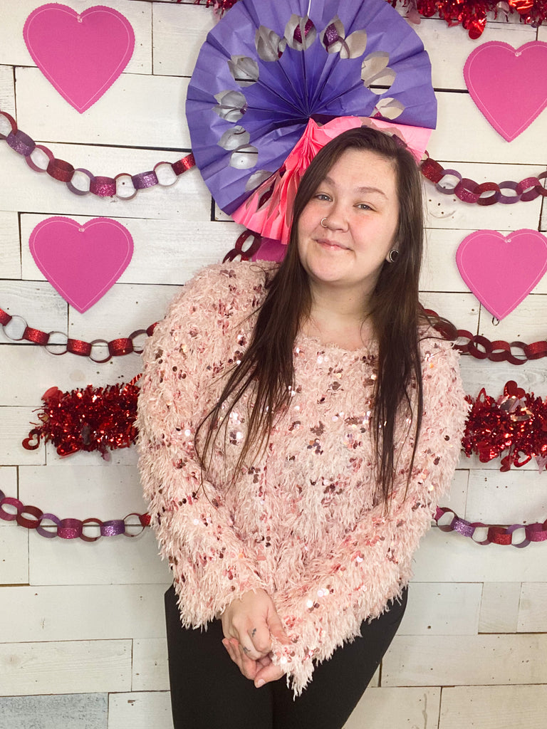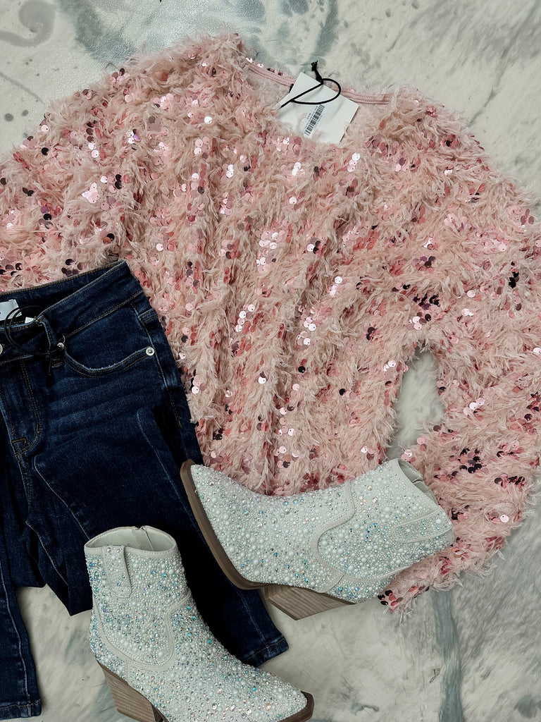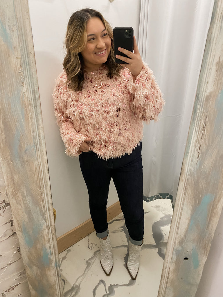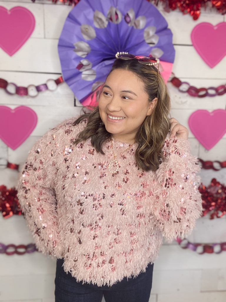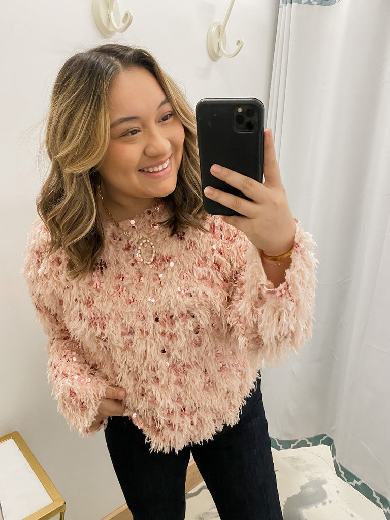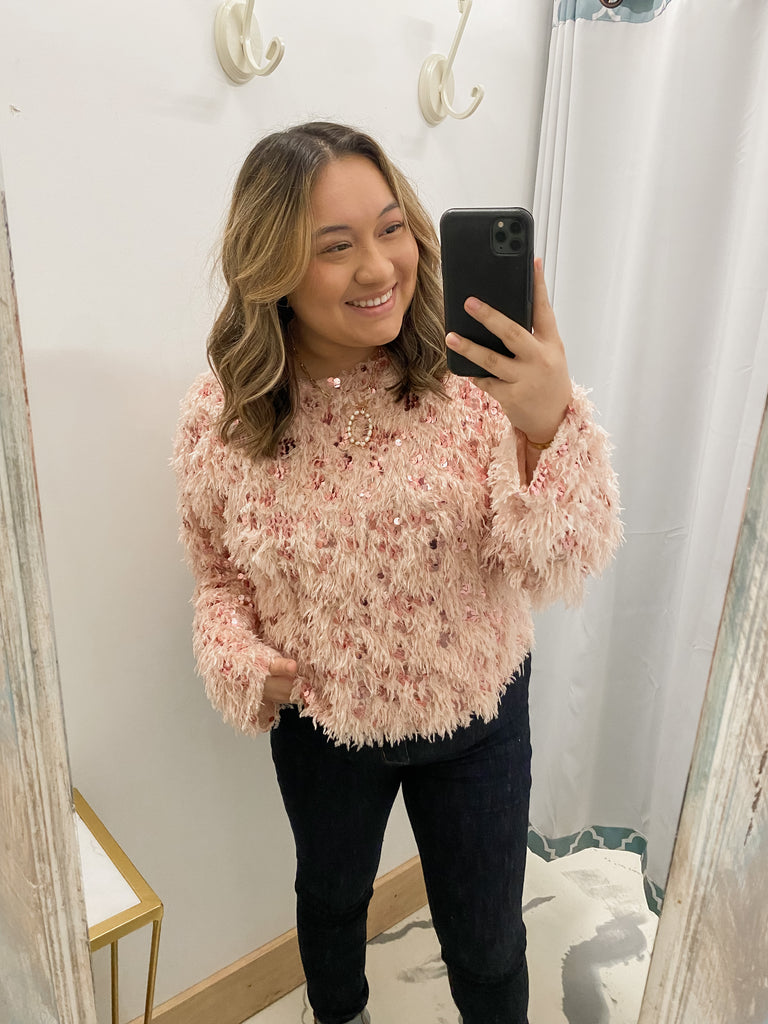 "Get ready to sparkle and stand out with our Let Your Sparkle Shine sweater! This fuzzy, pink sequin sweater is not only true to size, but also adds a touch of fun and playfulness to any outfit. Don't just blend in - let your unique style shine!"