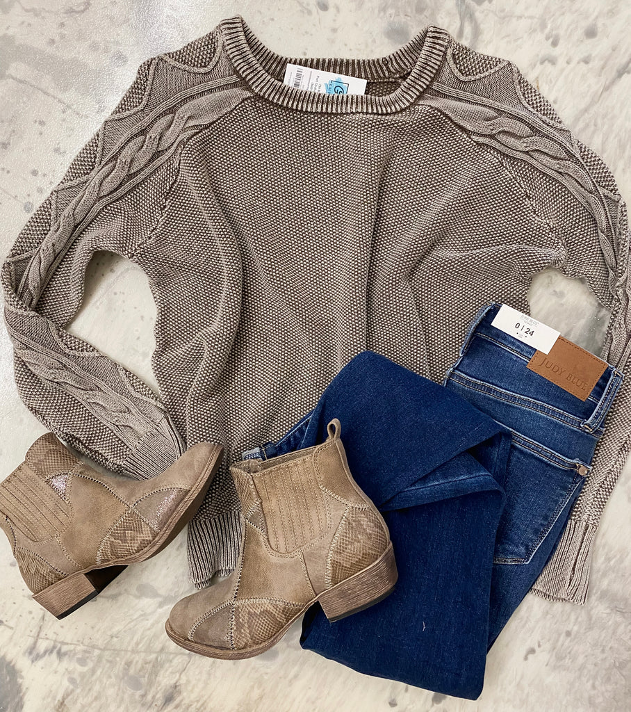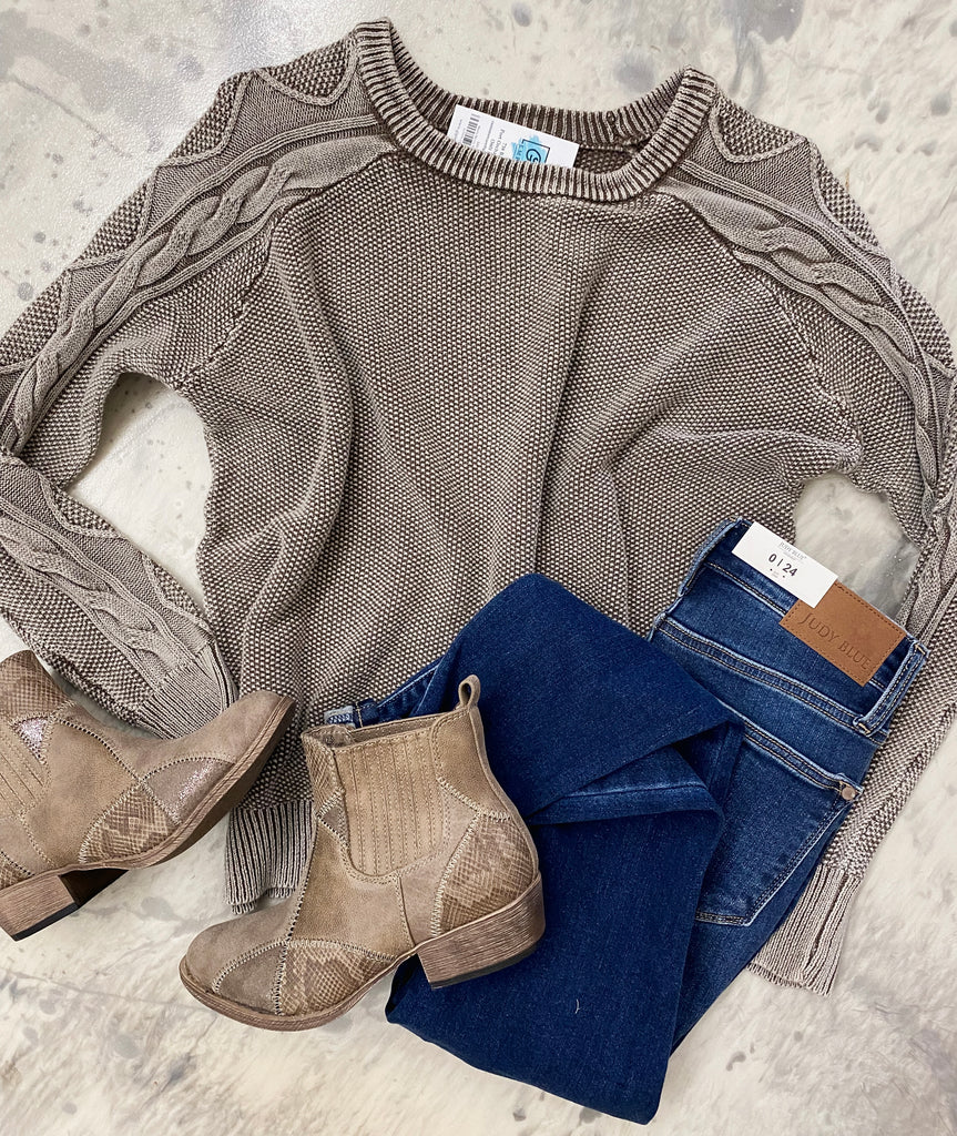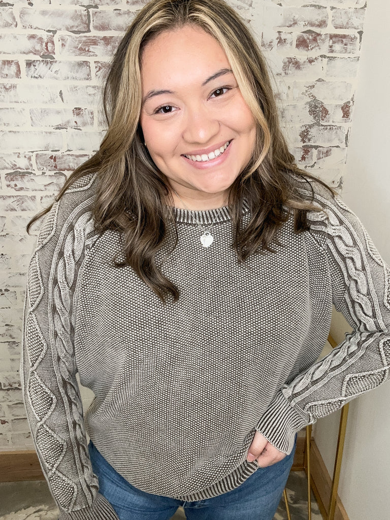 Get ready to snuggle up in style with our Macha Mocha Sweater! This cozy sweater is perfect for chilly days and its cable knit detail on the sleeves adds a touch of personality. Plus, it's true to size so you can rock a comfortable and fashionable look.